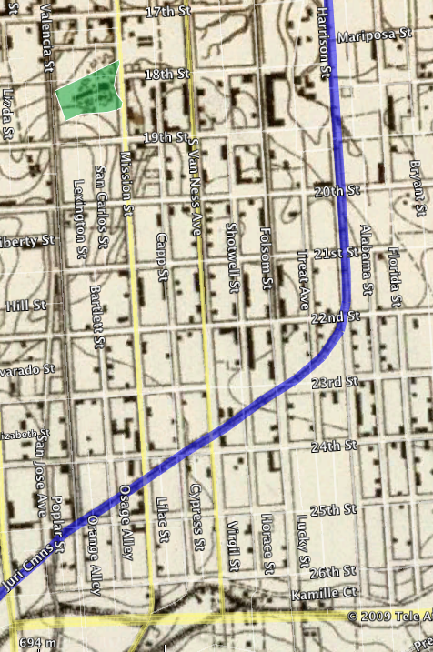 I’ve got enough material to fill a huge book, but am not the publishing type in that format. I figure that I will do a slideshow of maps that go back thousands of years hystorically (spelled purposely). The idea of drilling down to the Mission through hundreds of maps gone back so far has been very fun to do. I’ve always held out hope that there might be a few more unknown maps out there that would help build up more historic information about the neighborhood, especially on the kind of level seen with the birdeye maps, after 1880 up until the quake. The only other alternative are photos of the north mission and at this point I’m focussing on 16th (center) and Howard around Adair.