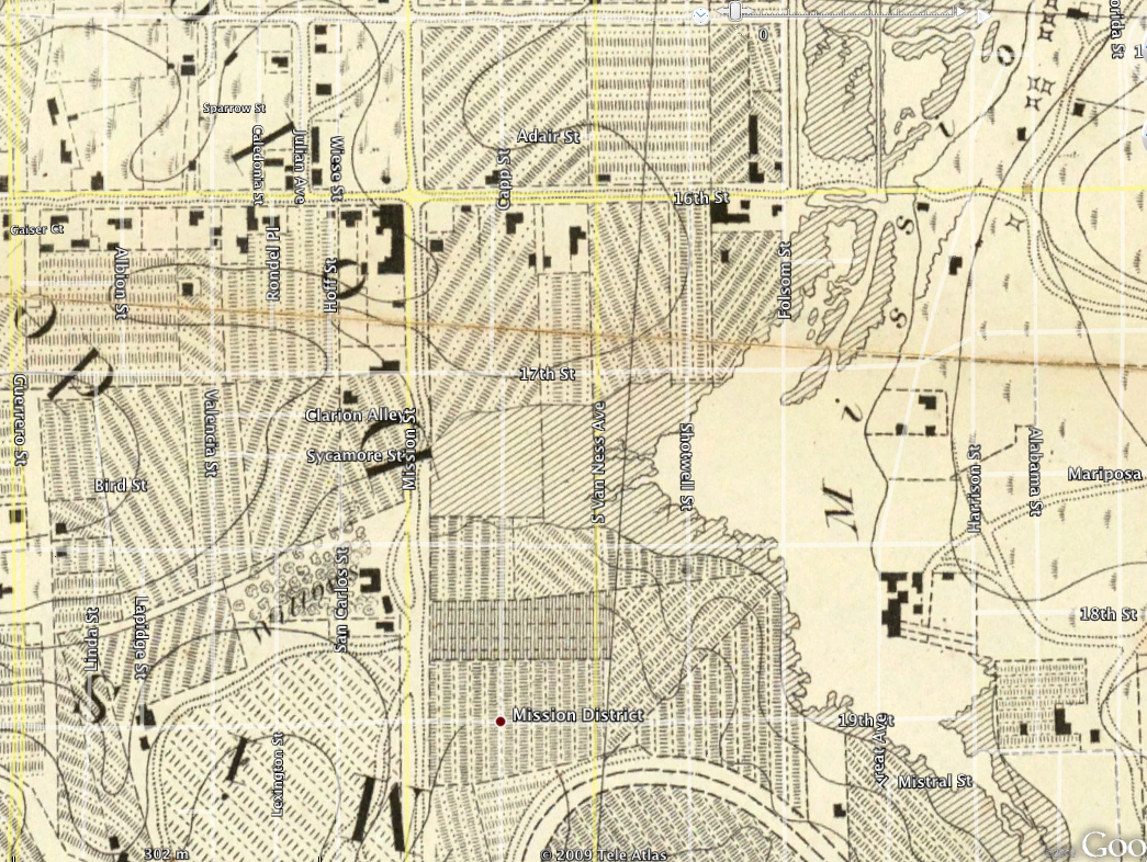 On an aside, Mission Creek was officially filled in by the city in 1876. In a major disaster the contractor started the job just prior to the rainy season starting at the bottom of the creek, resulting in swamping effects all the way up to 18th street.