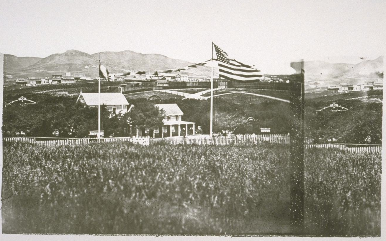 Where was this picture taken? Since it looks like Mission Dolores is to the left of the flag, above the fence, I strongly suspect it was taken from the edge of the Union Race Course. If so, then here’s the point of view: