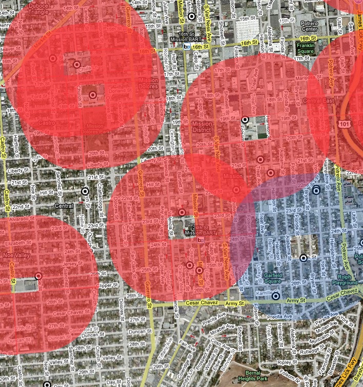 Despite your implications, I’m not trying to stuff the map full of red circles. That’s the problem with a 1500 foot radius — it adds up. Even including the overlap, the no-go zone is over 3/4th of a square mile in the Mission alone!