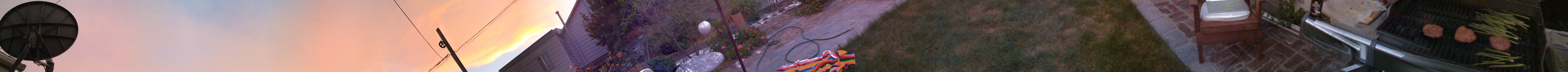360 spiral-orama via the iPhone — click to zoom 20x for 8409 pixels of perspective warping confusion. Note that the satellite dish on the left is immediately above my grill on the right.