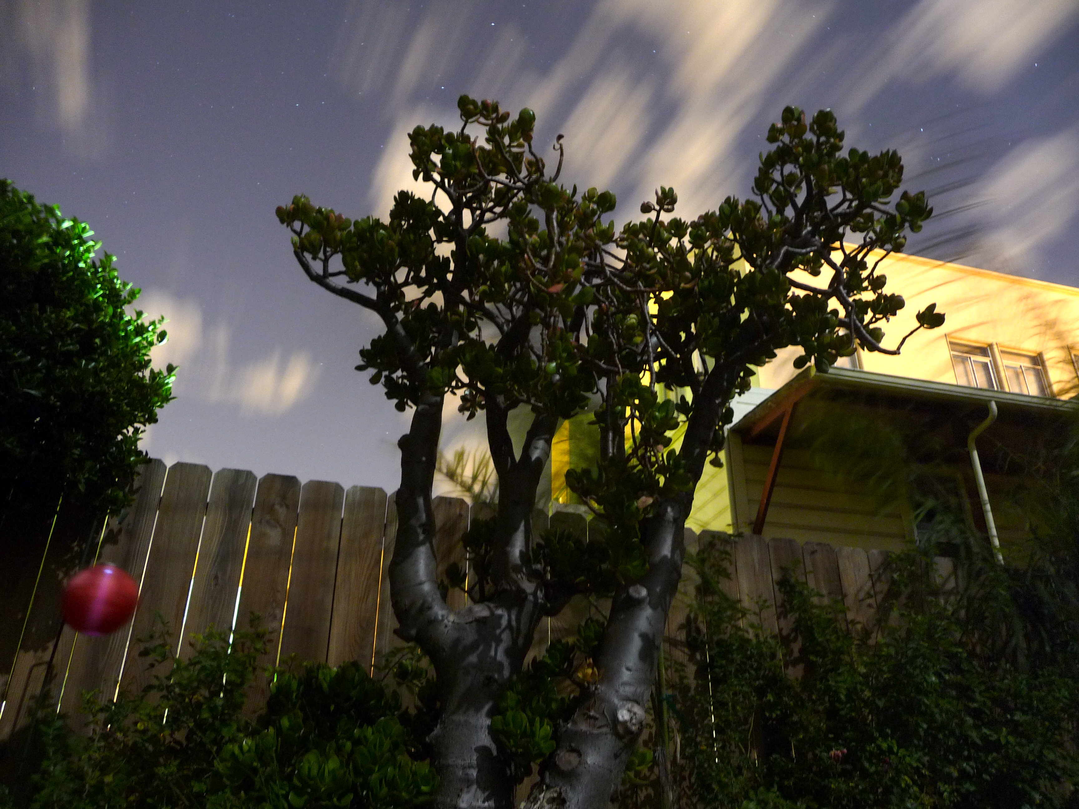 60 second exposure of night sky, clouds, and the ridiculously large jade tree in my back yard: