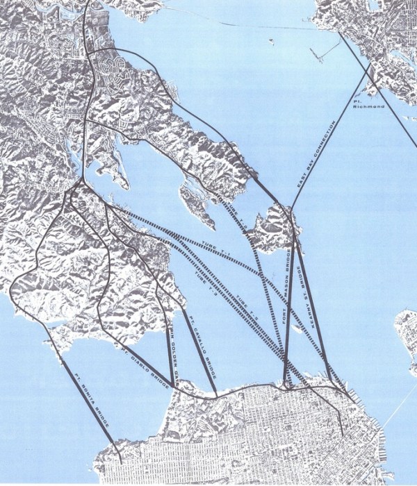 Sum of 1967 alternatives for San Francisco-Marin crossings, tube and bridge, via Eric Fischer and Scott Dowdee.