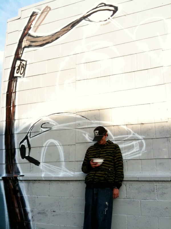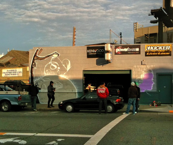 A welcome new mural underway on the walls of the New Sound SF car audio shop on Valencia & Duncan.