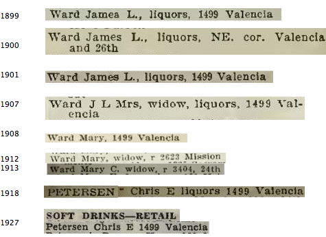 Drilling into what was where when — in 1889, Toad’s/1499 Valencia was actually 1441 Valencia (but nothing shows up in the directories).  By 1899 the block had been renumbered we see that 1499 Valencia was run by James and Mary Ward.  James passed away sometime between 1901 and 1907, and  Mary ran the saloon for a few years afterward. (There is a widow Mary Ward listed in the neighborhood until 1913 though it is unclear if it’s the same one.)