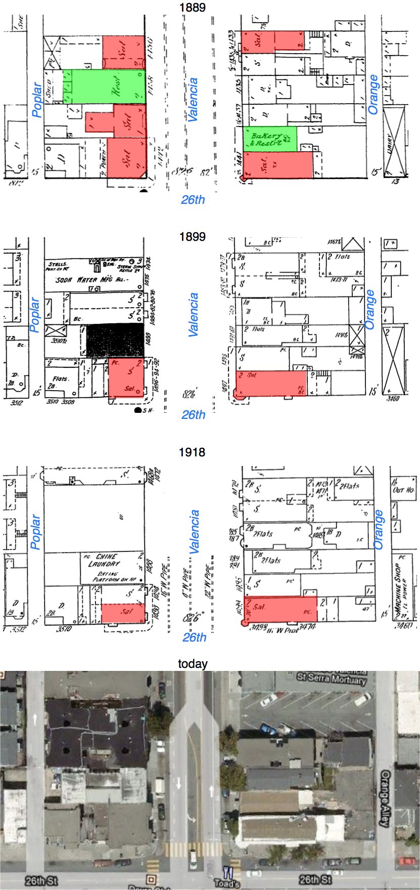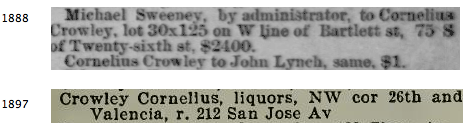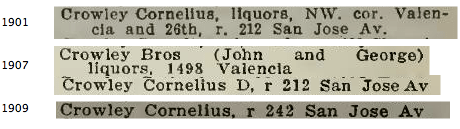 From at least 1886 to at least 1901 (if not 1906), a man with the particularly awesome name of Cornelius Crowley ran a saloon on the NW corner of 26th and Valencia.