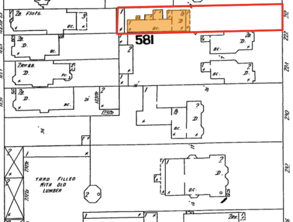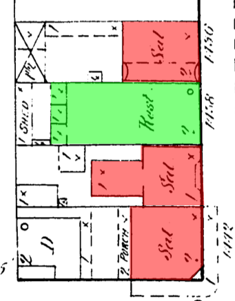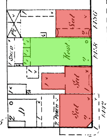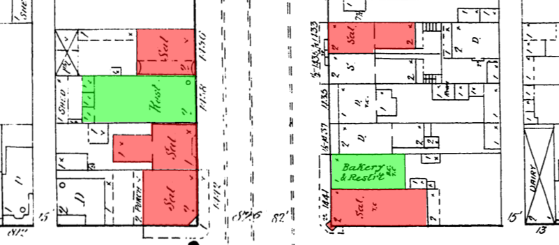 Anyway, that building has been there since at least 1889, and as you will no doubt be unsurprised, the corner has always had bars and restaurants aplenty as we can see from the Sanborn maps.  (Red are bars and green are restaurants. S stands for store, F for Flats and D for dwelling. (The Sanborn codes are deceiving – for the record, “Out Ho” sadly does not stand for out house, just “Outer Building”. But FB stands for Female Boarding, aka Bordello.))