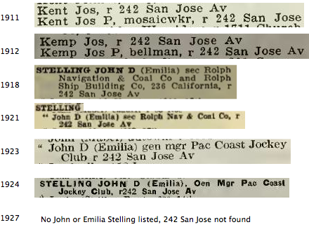 I live at the current 242 San Jose Ave and was fascinated to read this. The current house was built in 1916 at one time was owned by Mayor Rossi. It is unclear whether he lived there himself or it was bought for a lady friend. He was a florist and there is a bust of him in city hall.