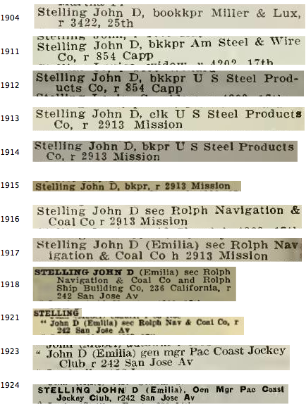 John Stelling was a bookkeeper, and I thought it was a bit odd he moved into a giant house like that. One possibly related tidbit — he worked for Rolph Shipping, owned by Rossi’s predecessor, Mayor “Sunny Jim” Rolph (1911-1931), who helped start Muni amongst other things. Connections?