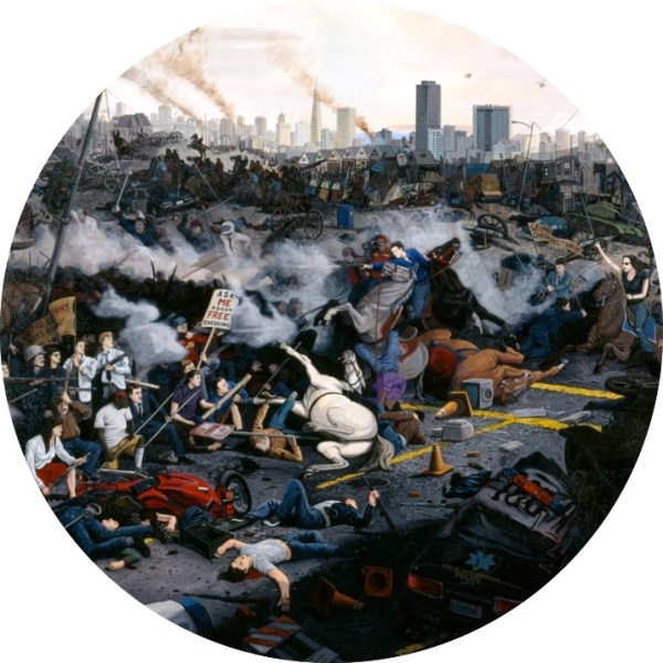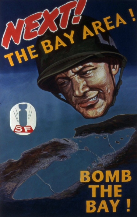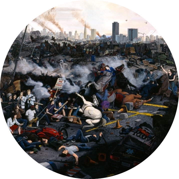 In 1996, Southern California artist, Sandow Birk, was invited to have an exhibit in San Francisco at Catherine Clark Gallery. “I spent a month living with a friend up there, painting and hanging out,” Birk recalled. “And everywhere I went, people would hassle me for being from Los Angeles. I’d be sitting in a bar and people would ask where I was from and then they go off on me: `It’s so horrible,’ and `How can you live there?’ At first it was kind of comical, but it became annoying. And that’s how I started having this idea about a fake war.’’ Birk imagined San Francisco’s worst nightmare: an invasion by Los Angeles.