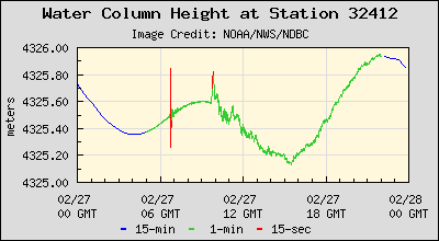 Here we see the readout from a DART buoy about 500 miles off the coast of Peru from the day of the earthquake. The smooth blue curve on the left shows the normal ebb and flow of the tide.