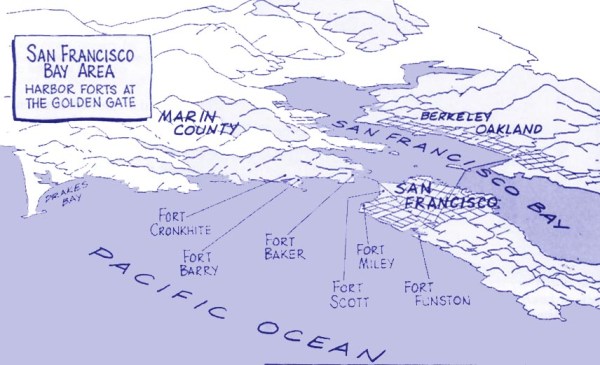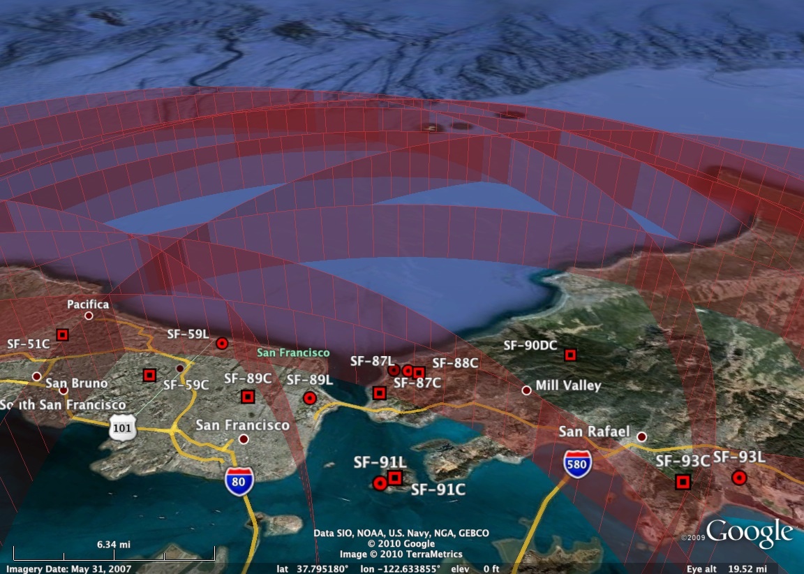 Nike Missiles on Angel Island (SF-91L).  Other launch sites included the Presidio and Ft. Funston, and radar control centers (C on the map above) included Mt. Sutro just about every sizable peak in the area.