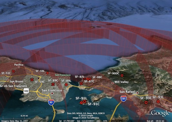 Control centers  are squares and launch sites are dots, KML from here. Circles are the Nike’s 25 original mile radius. (Drew them myself, here’s my KMZ. Do you have any idea how annoying it is to generate circles in Google Earth? Come on, Mountain View — they’re freakin’ circles.)