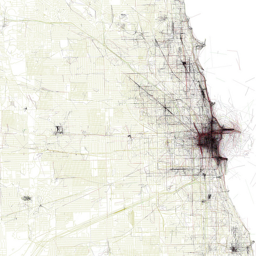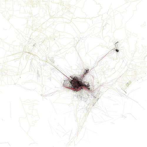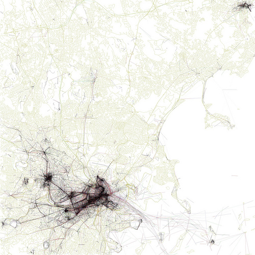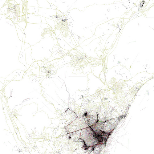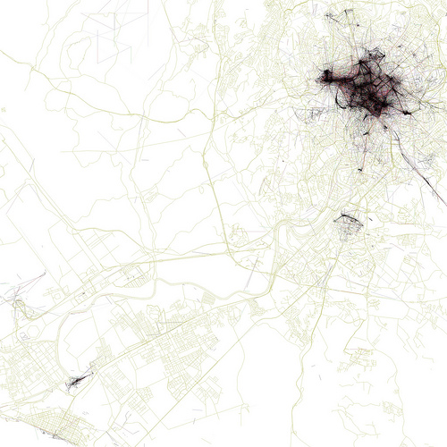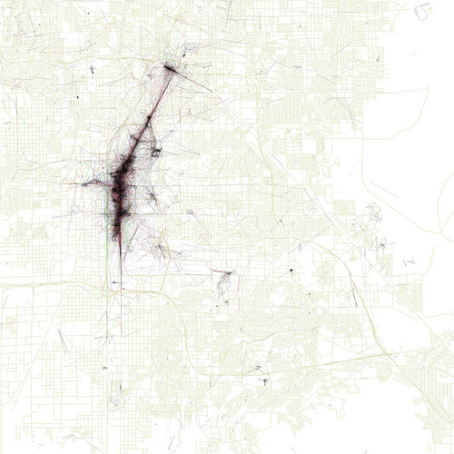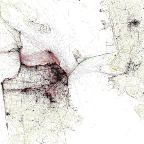 Yet again Eric Fischer kicks geospatial and urbanism ass and has his robotic assistant take names. I am curious about how this was done — is it just pairs of photos from the same source that are then strung together in a linestring and colored by distance between points divided by time apart they were taken? That is extremely elegant and clever. Do these photo site api’s let you query huge areas or do you have to do it in pieces?