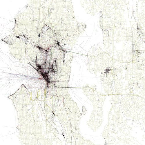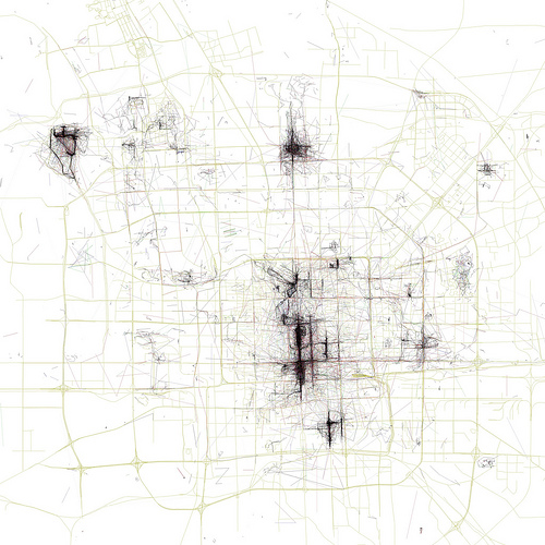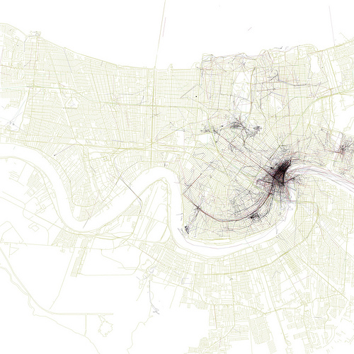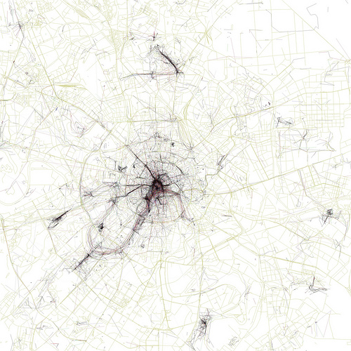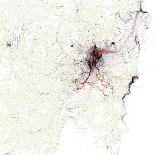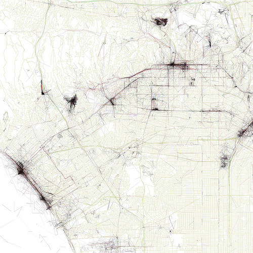The maps are ordered by the number of pictures taken in the central cluster of each one. This is a little unfair to aggressively polycentric cities like Tokyo and Los Angeles, which probably get lower placement than they really deserve because there are gaps where no one took any pictures. The central cluster of each map is not necessarily in the center of each image, because the image bounds are chosen to include as many geotagged locations as possible near the central cluster. All the maps are to the same scale, chosen to be just large enough for the central New York cluster to fit.