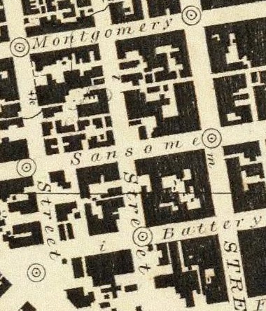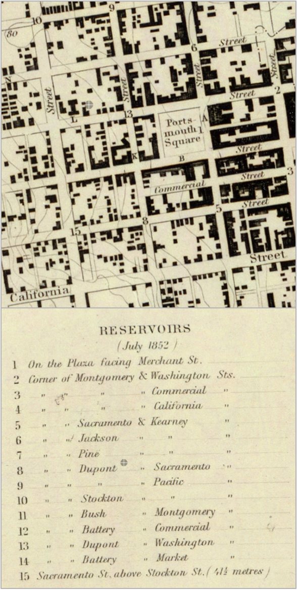 These upgraded and reinforced cisterns were a big part of the redesign of the fire response system after 1906 — the cisterns were to be a source of water of last resort if the water mains were destroyed. They had been around since the 1850s — in fact you can see them in the 1853 and 1859 Coast Survey Maps: