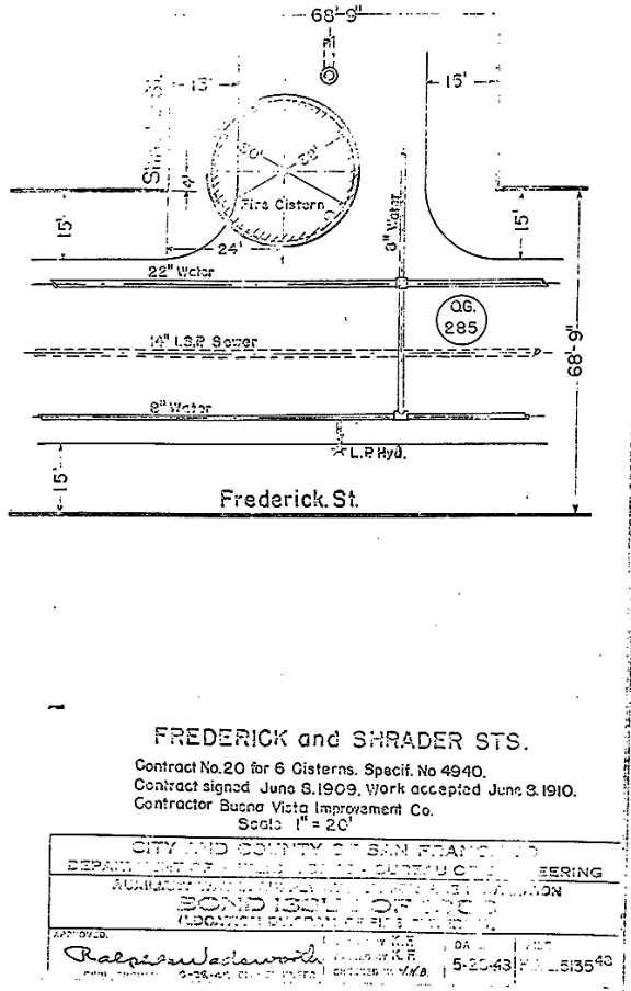 CVA quickly passed the SF history/infrastructure rite of passage and discovered they are SFFD water cisterns. But what was impressive was the route they took to get this information. They emailed the SFDPW and got a great response, including the original 1909 plans for the 75,000 gallon cistern on Frederick & Shrader: