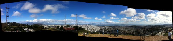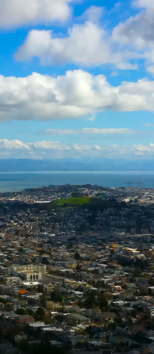 And a more traditional panorama, with requisite puffy clouds — 180º, Sutro to Candlestick, 8600 pixels wide, click image to zoom (6 images merged with Autostitch on the iPhone)
