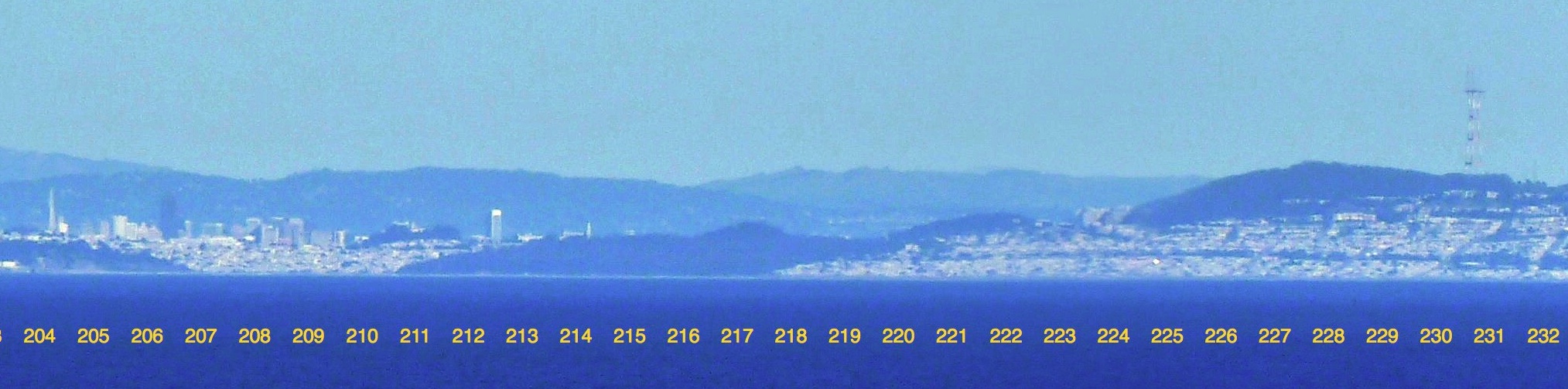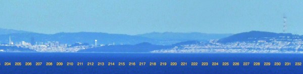 I took a map cobbled from Google Maps screenshots, put a 360-degree radial grid onto it, centered on the Farallons. After marking the degree points where the radiating lines intersect identifiable landmarks, I was able to arrange corresponding lines onto your numbered panorama. Here are my calculations, with the obvious landmarks included: