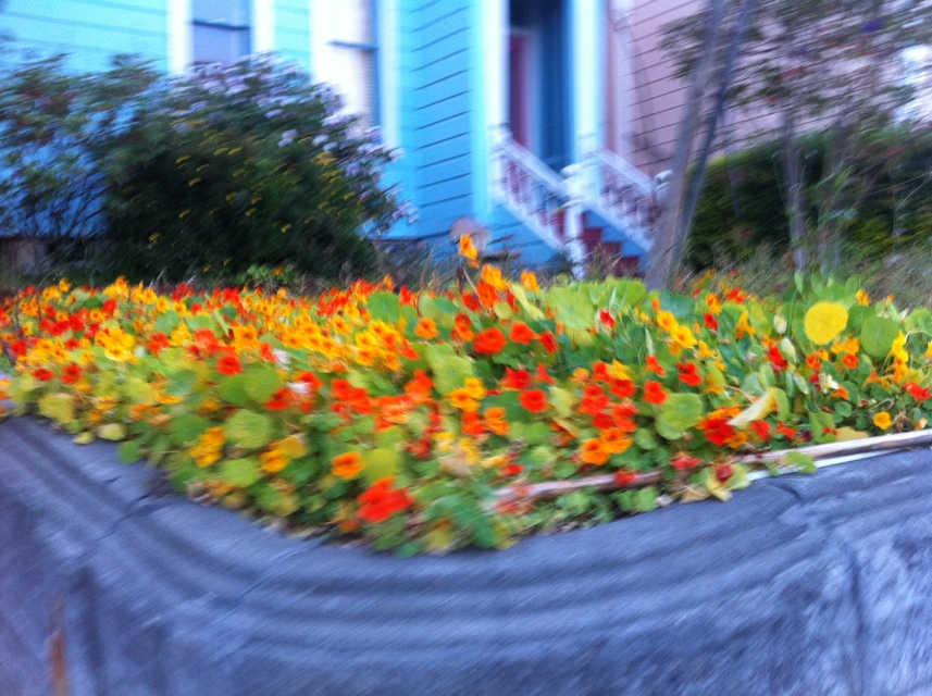 Nasturtiums are making me hungry for salad. Seems like they’re putting on an extra-colorful show lest they be taken for Bruins fans. Love the texture on that wall, too!