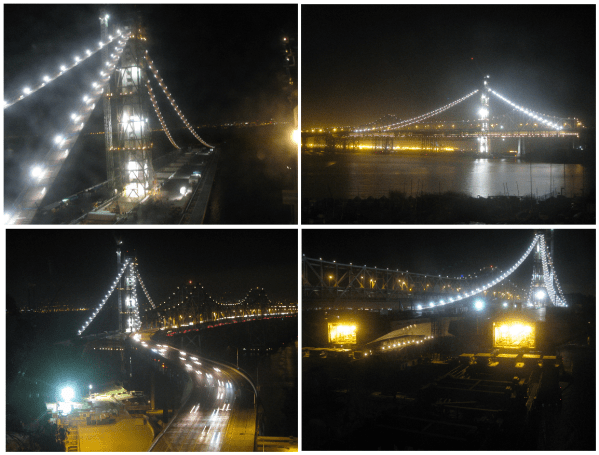 The @Bay Bridge‘s construction catwalks <1991>I’m. Too sexy for this blog. Too sexy for this blog. I can’t see through this fog.</1991> were illuminated this evening. There are nice webcam shots trapped in a crappy flash player, but we have set them free! (Well, in a grid.)