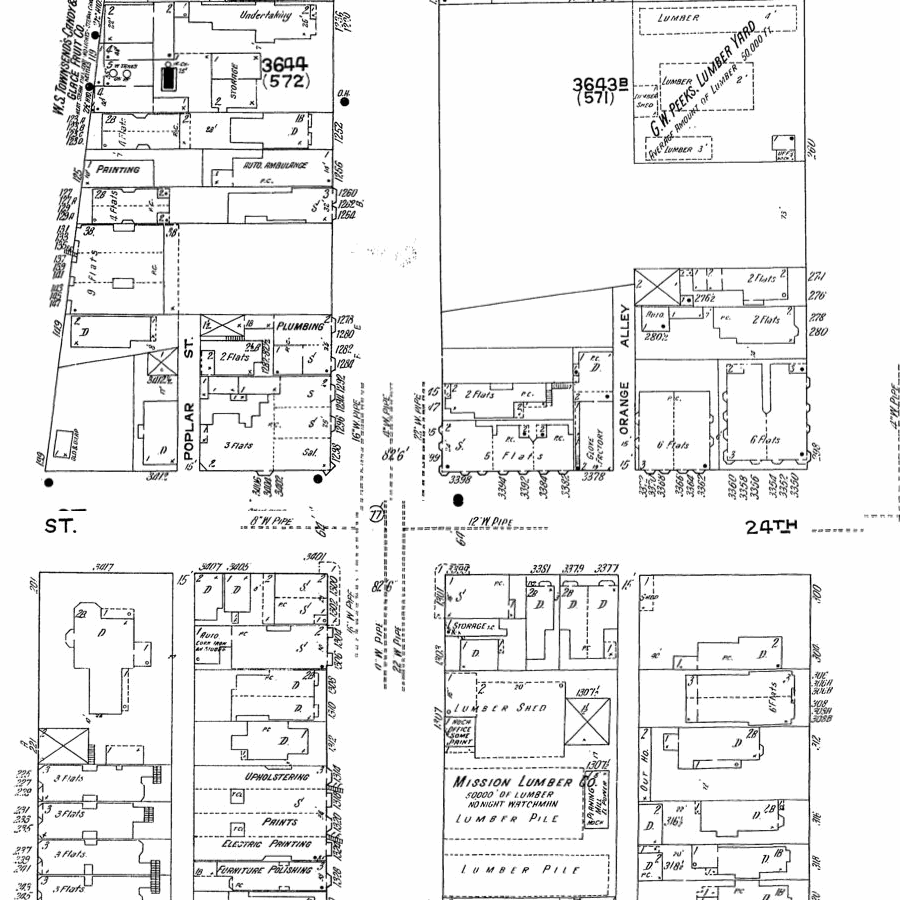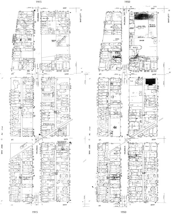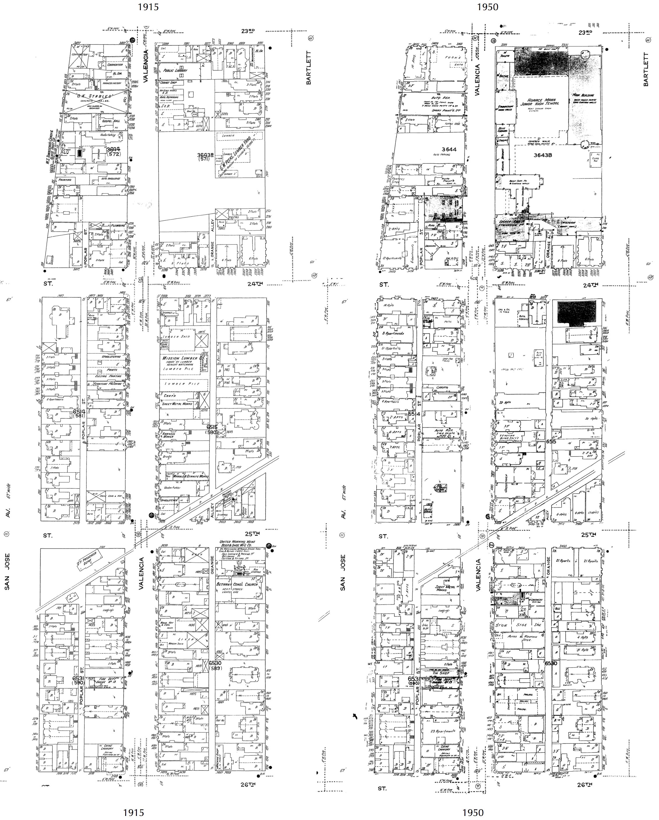 Zooming in 24th and Valencia, here’s 1915 vs 1950 in an animated GIF with a 35 year delta. The two photos were taken on the left looking right (east looking west), and top looking down (north looking south) respectively.