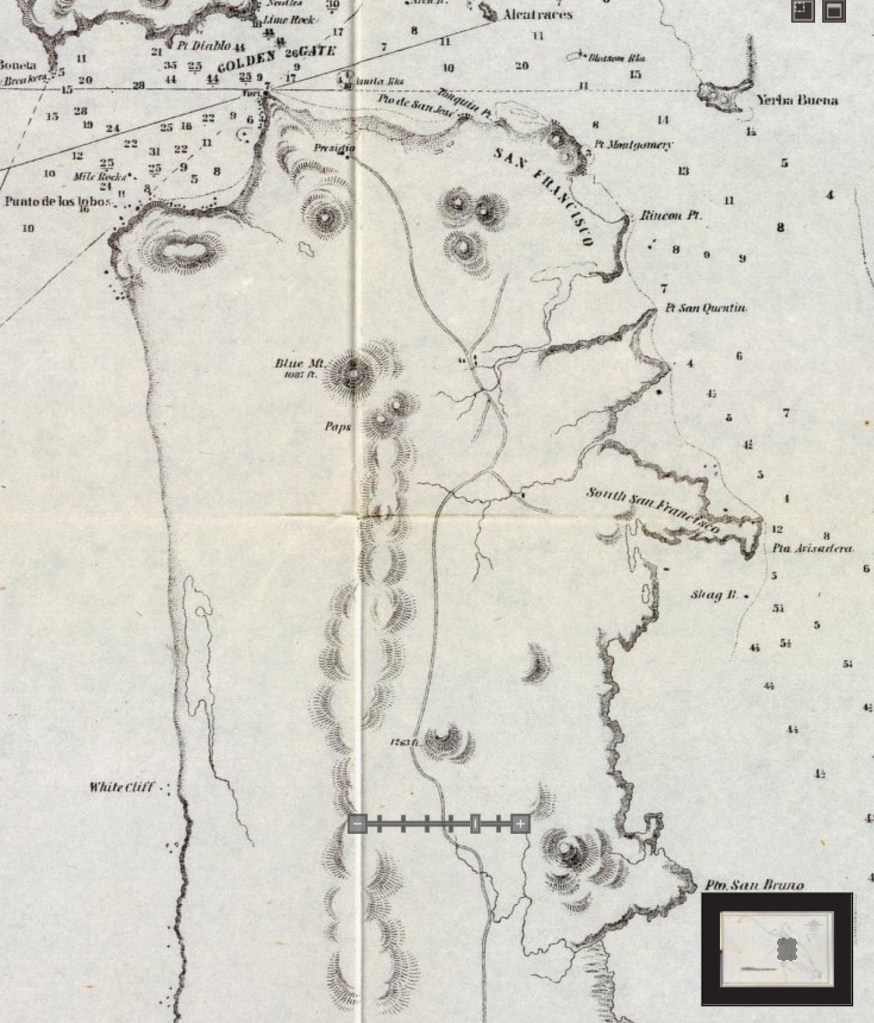 For the past few years, I’ve been noodling around with tracing the path from La Lengua to Mission Dolores, which is pretty straight forward. The path to the Presidio gets harder as the map stops at Geary, though I’ve made my best guess based on the wider-scale maps and topology: