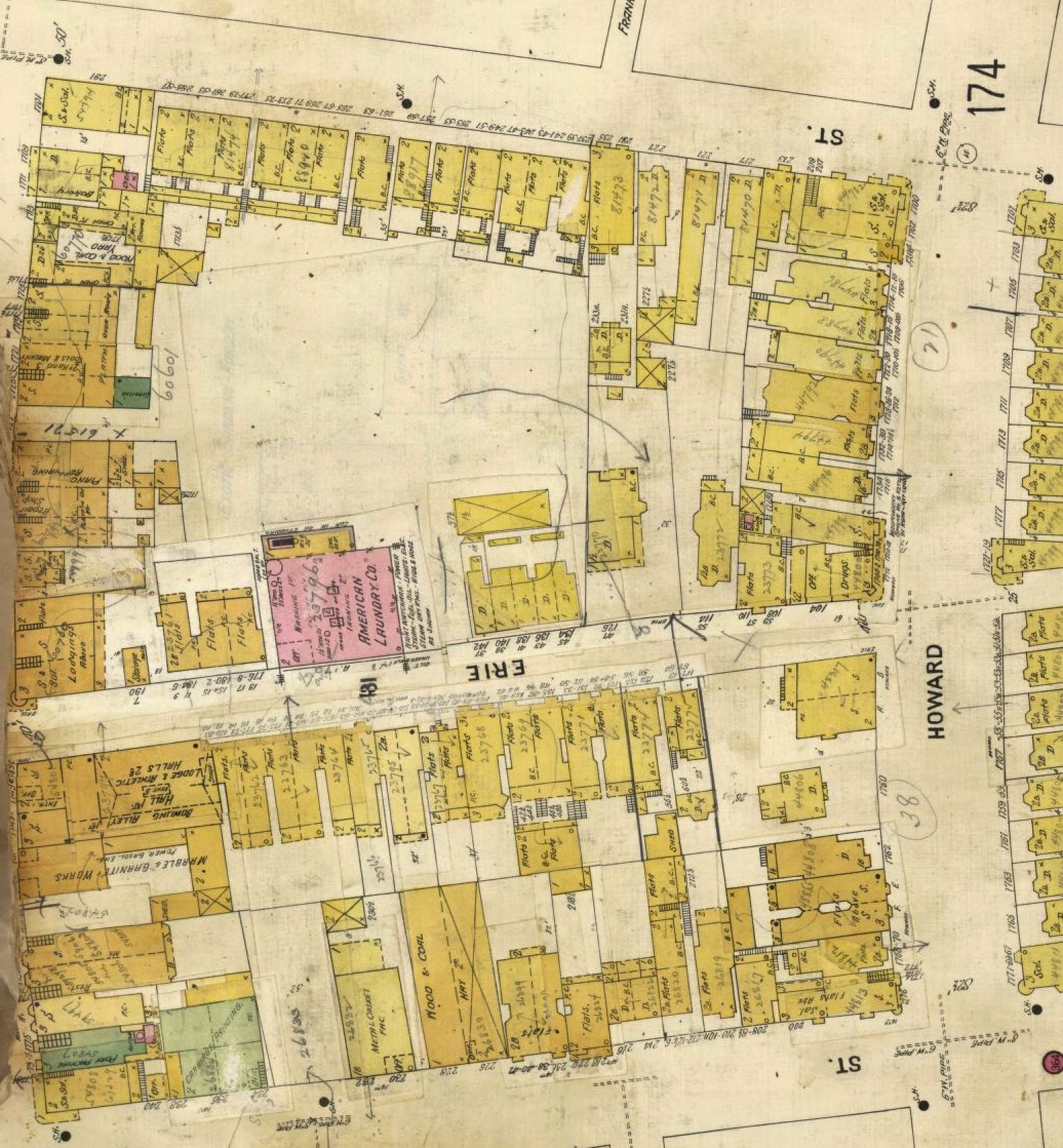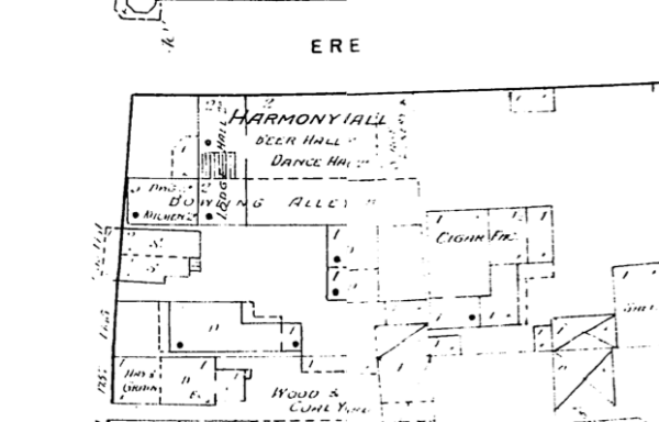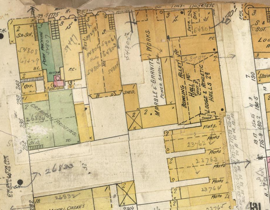 Quite the place — bowling, dancing AND laundry next door, right next to today’s Public Works. (And “pork packing” around the corner (green building).)