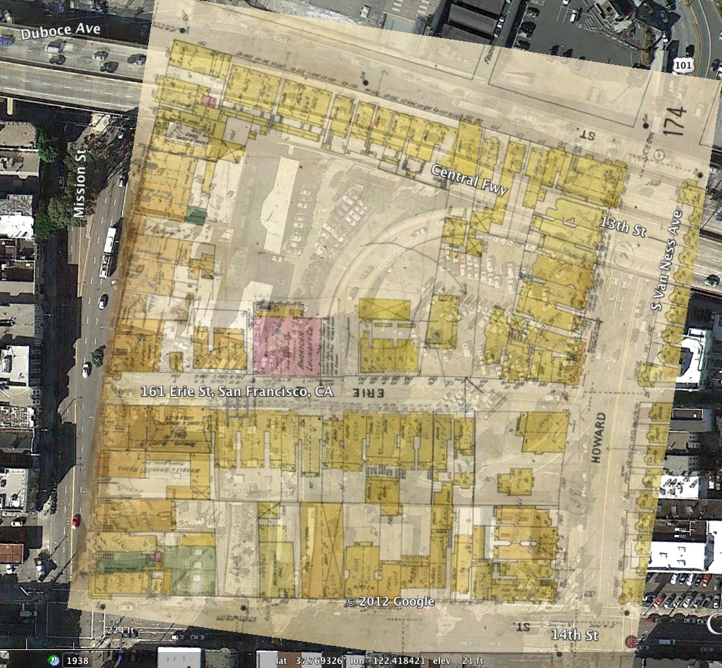 Hey, look, 161 Erie St in 1905, before the earthquake and fire! Howard is now Van Ness. Mission St is to the left. 13th St up top. (Click to zoom.)