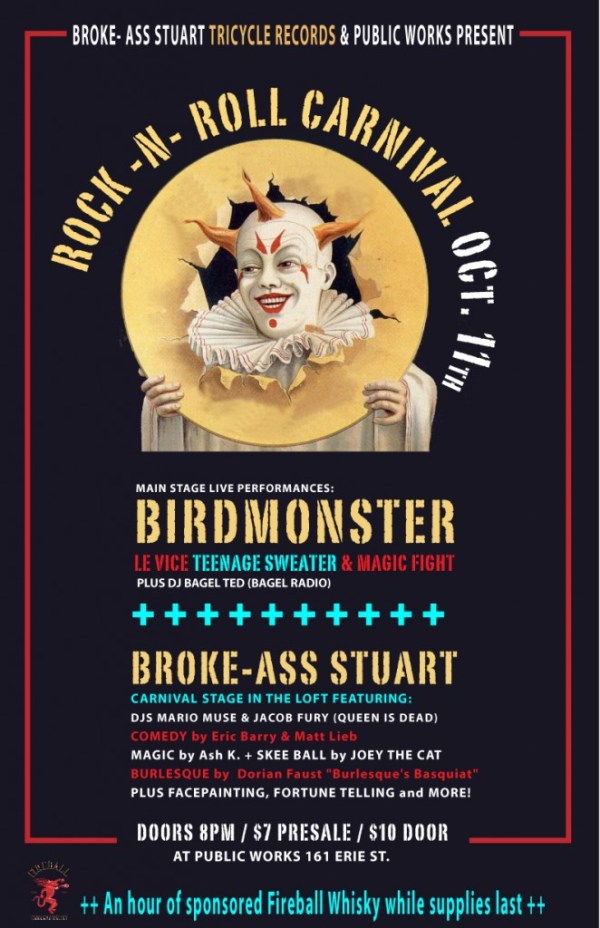 Behold Broke-ass Stuart’s latest extravaganza, Thursday at 8PM, 161 Erie St (& Mission).