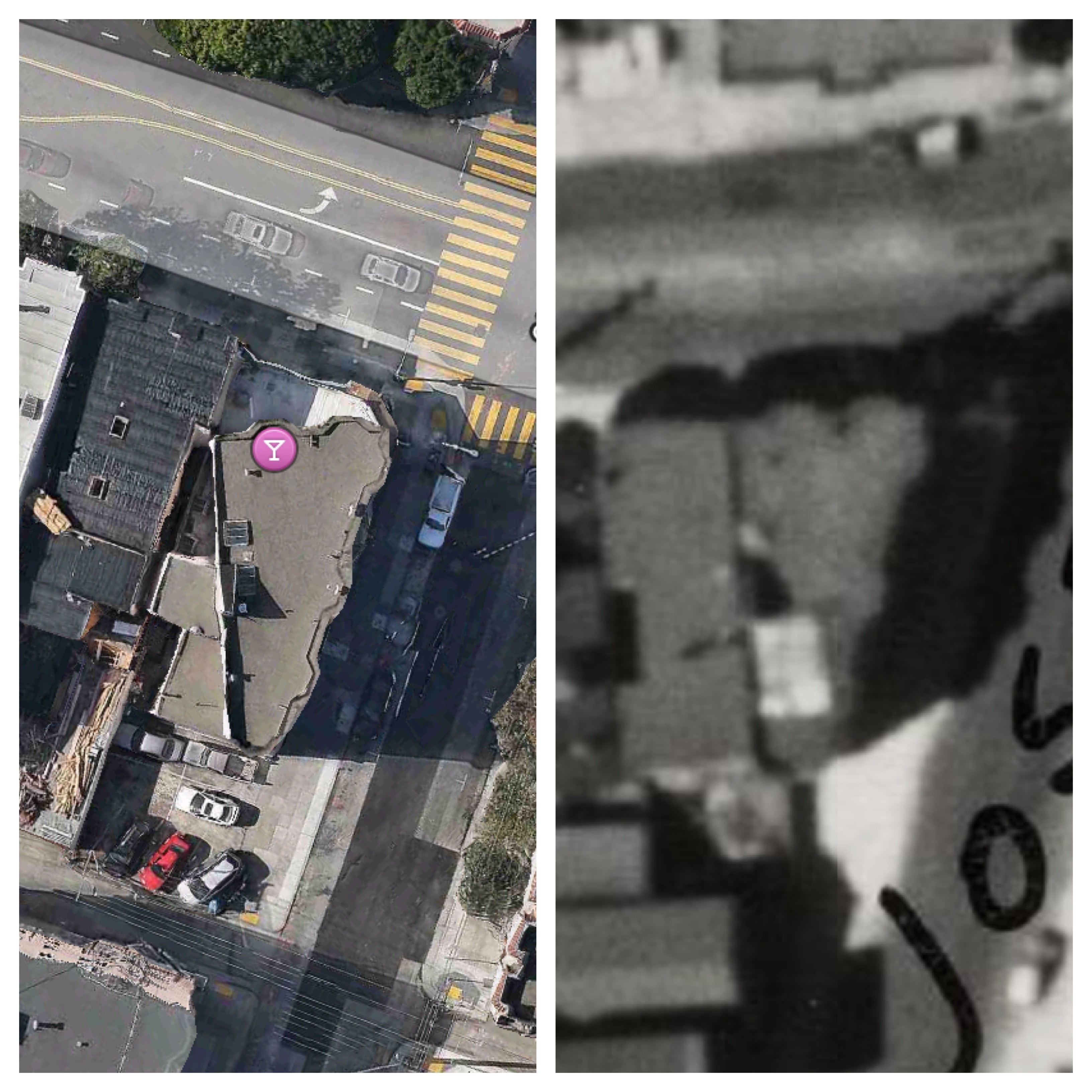 You can all thank the esteemed Jonathan Lammers, architechælogist, who went on an historical building hunt using the 1938 aerial photo set scanned by the honorable David Rumsey.
