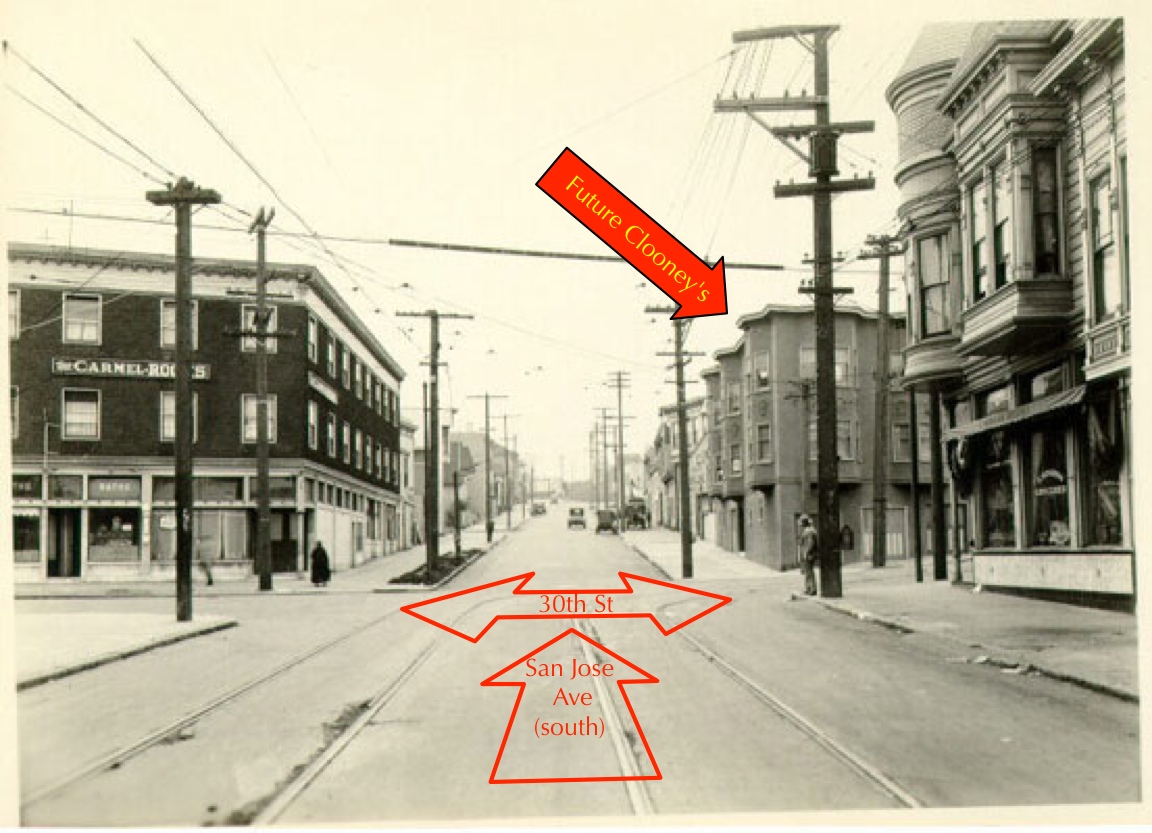 I am not exaggerating in saying that I found a good candidate for Clooney’s in less than thirty seconds: an odd-shaped building on the southwest corner of San Jose Avenue and 30th Street. It had two slanted bays facing north onto 30th Street, and three slanted bays fronting the diagonal line of San Jose Avenue. The location of the light well also seemed just right. Feeling lucky, I decided to take a quick look at the SFPL historic photo collection to see if it might have an old photo of the intersection. Miraculously, it does. And there on the right hand side of the photo is what I feel certain is today the building housing Clooney’s at 1401 Valencia Street.