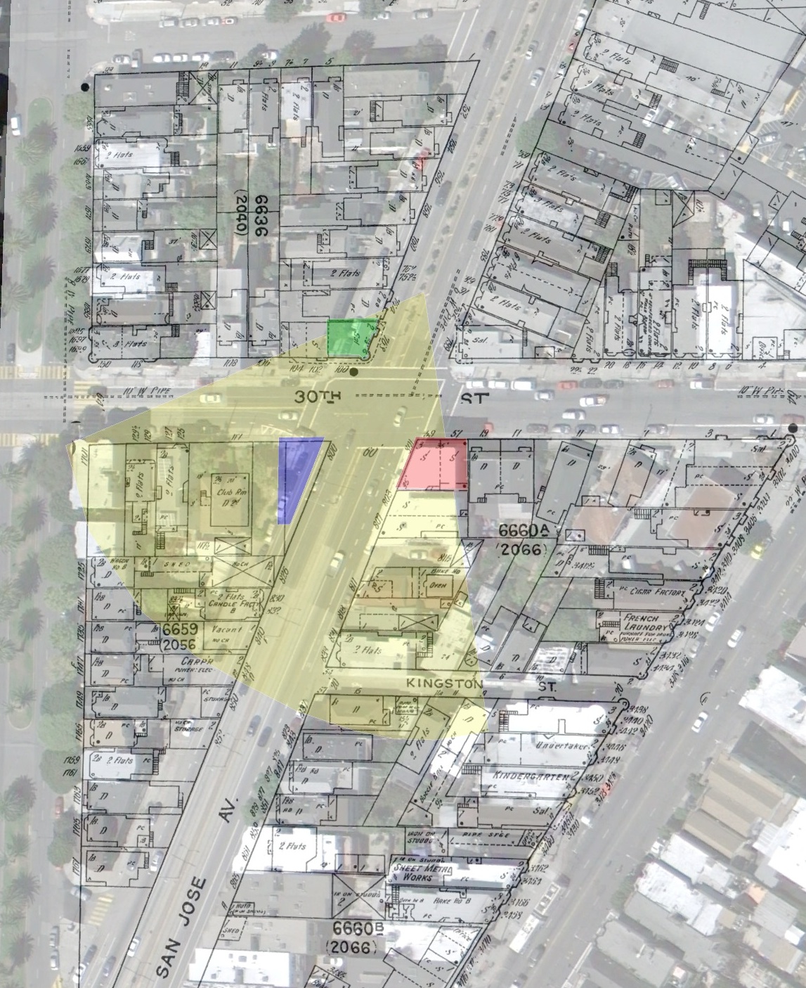 The intersection of San Jose and 30th is almost completely unrecognizable compared to today. I wrote about this intersection over at Mission Mission last year and unbeknownst to me, I even marked the proto-Clooney’s apartment buildings at 800 San Jose Ave in my BurritoVision overlay!