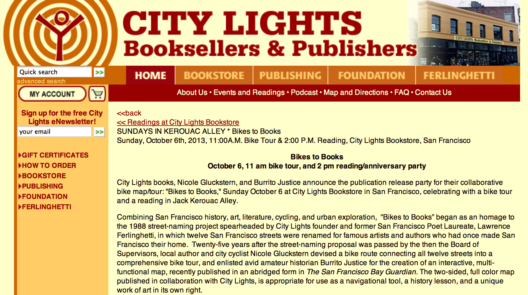 City Lights books, Nicole Gluckstern, and Burrito Justice announce the publication release party for their collaborative bike map/tour: “Bikes to Books,” Sunday October 6 at City Lights Bookstore in San Francisco, celebrating with a bike tour and a reading in Jack Kerouac Alley.