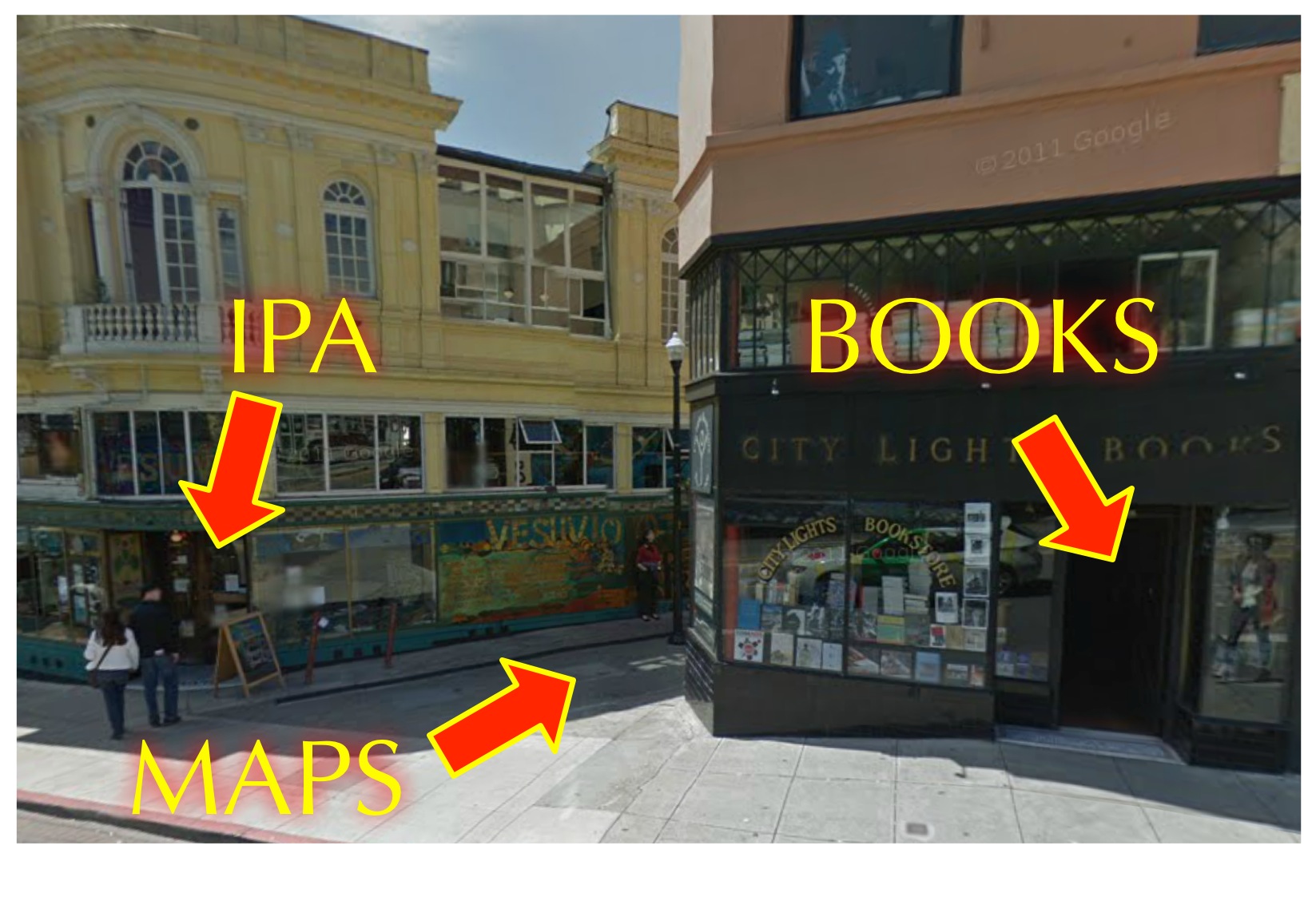 While I don’t think we can crack open IPA in the alley, Vesuvio is right next door. In case you get confused, here is an explanatory diagram: