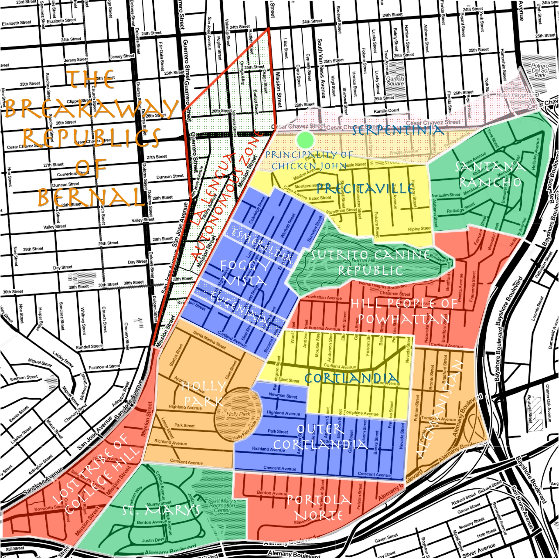 The case of Precitaville, base of Industrial Magnate Telstar Logistics, is a curious one. Nominally the progenitor of Bernalwood, this cartographic charlatan has in fact been planning a break from the Bernal Hegemony. However, the twisted history of Precita Creek is far too strong, and Precitaville is already facing the revolt of the valley of Serpentinia. Then there is the Principality of Chicken John, a cultural force whom few dare challenge.