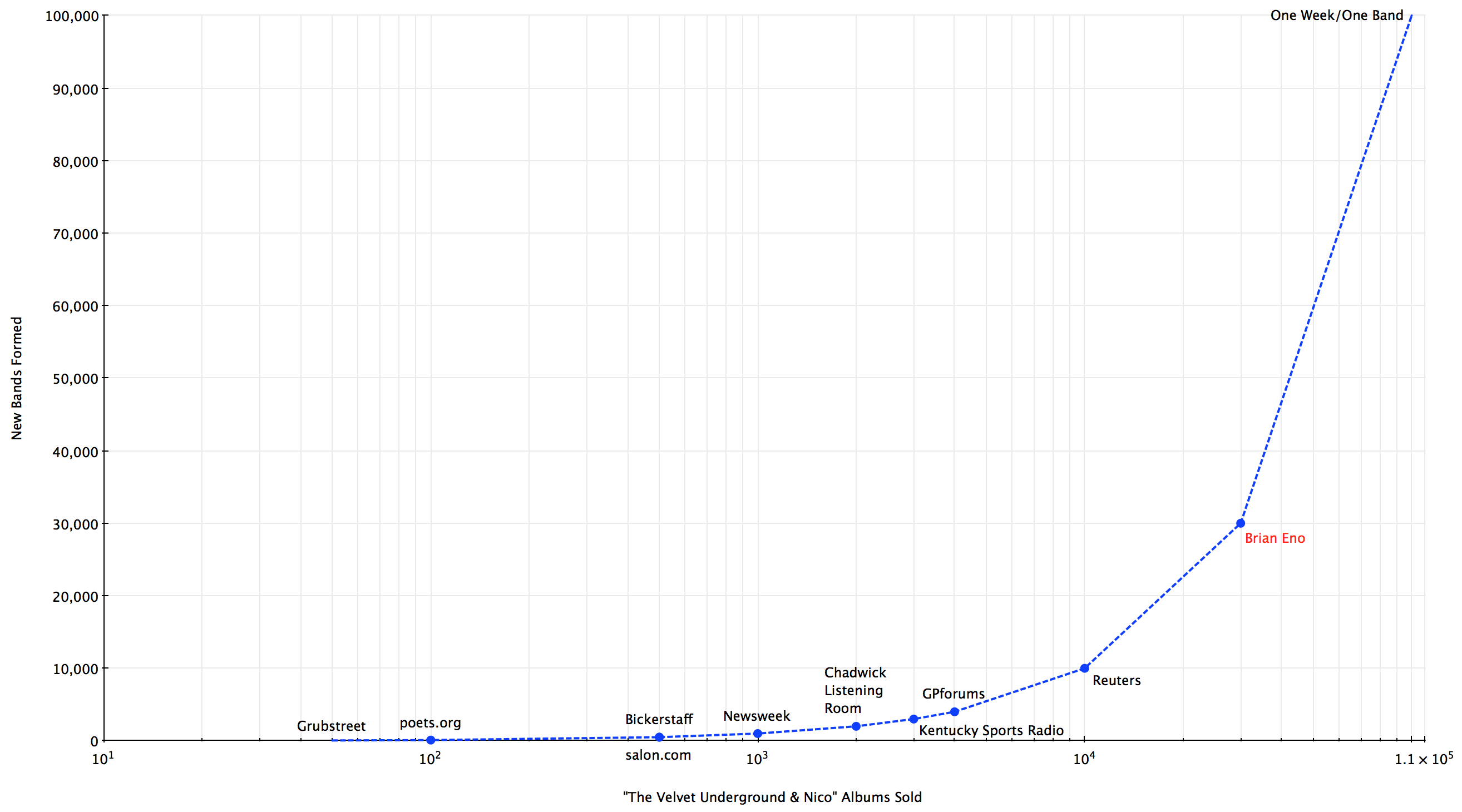 The Velvet Underground’s first album in 1967 was massively influential. An apocryphal quote: “The album may have only sold [x] copies, but everyone who bought it started a band.”