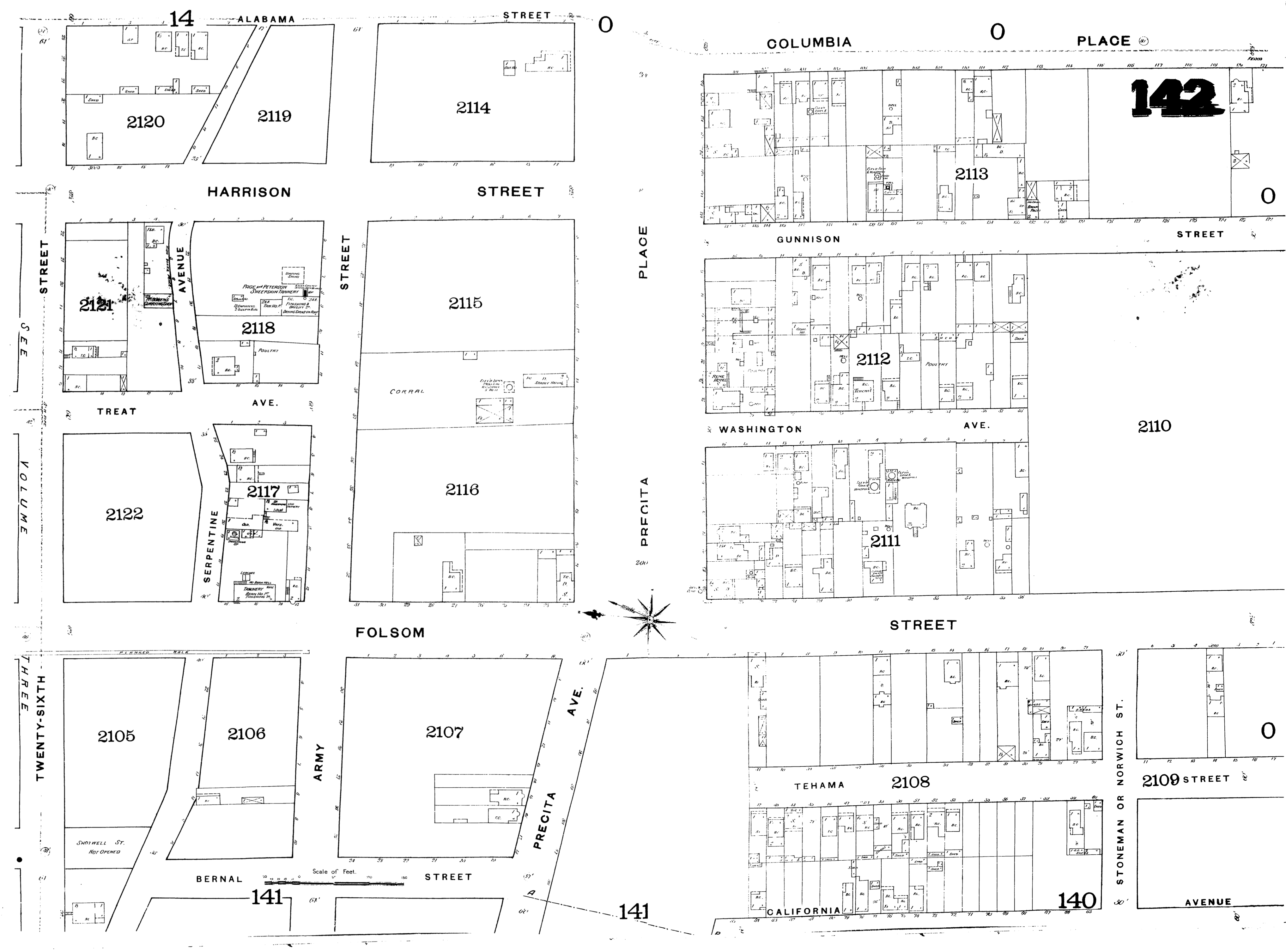 The first specific address, 431 Precita, shows up in the city directory in 1900. We can see the building in the 1899/1905 Sanborn Maps — Precita is on the left, Alabama is on the right.