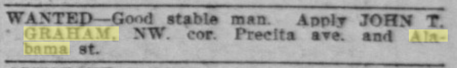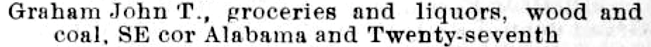 As to the location of J.T. Graham’s saloon, we suspect a Bernalian disinformation campaign that spreads even to the 1888 city directory level since 27th and Alabama did not intersect in the 1880s.