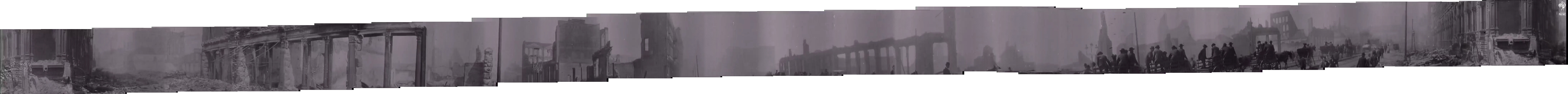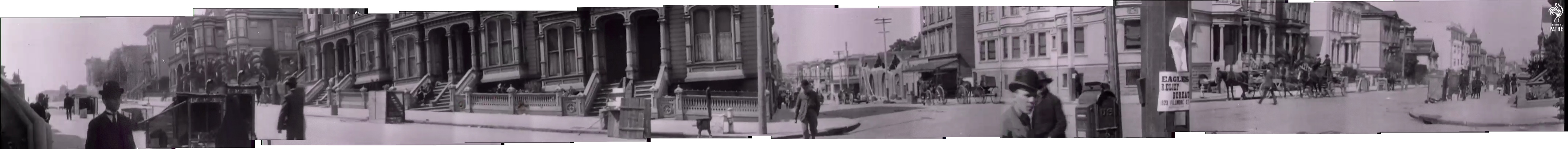 180 degree slow pan which I stitched into a panorama. Residential area, street on a slope, with a cross street that looks more commercial. Where is this? Fillmore? Divisadero? The 1905 Sanborns will help. Haven’t found anything that’s a good fit yet though.