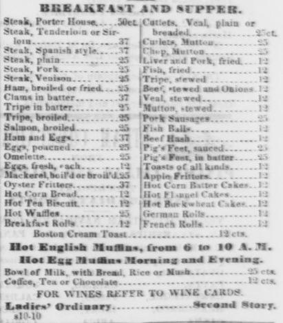 Apparently not many chickens came around the Horn, but notice that three eggs cost as much as a steak with truffles. 50 cents is at least $12 dollars adjusted for inflation — to be honest I suspect it would be even more given the hyperinflation of the time, and lack of supply and high demand. (If you were at last week’s Pop-Up Magazine, your heard about the Egg Wars on the Farallons.)