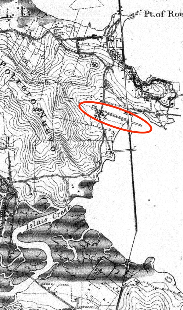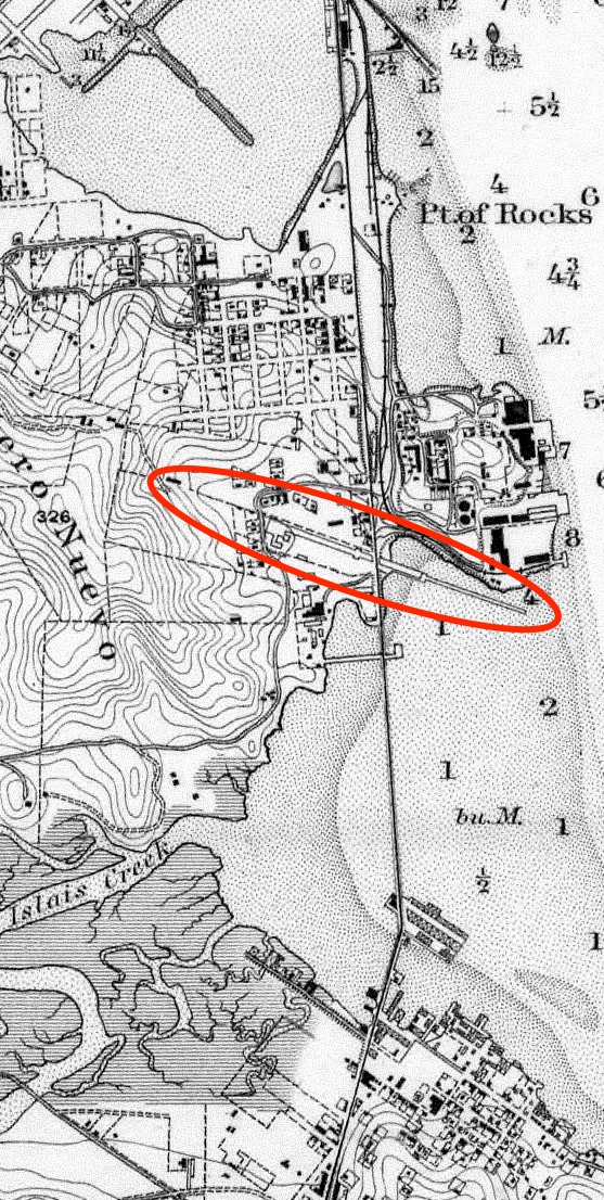 The 1886 Sanborns don’t show the extend of the rope walk, but it can be seen in this crop from the 1884 Coast Survey map, where it sticks a rather significant distance into the bay.