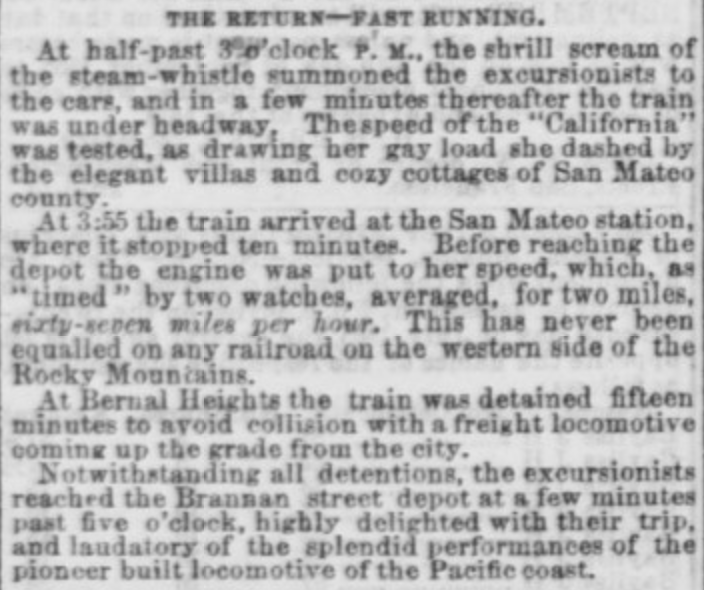 I’ve previously mentioned that the train from San Francisco to San Jose set a speed record in 1865: