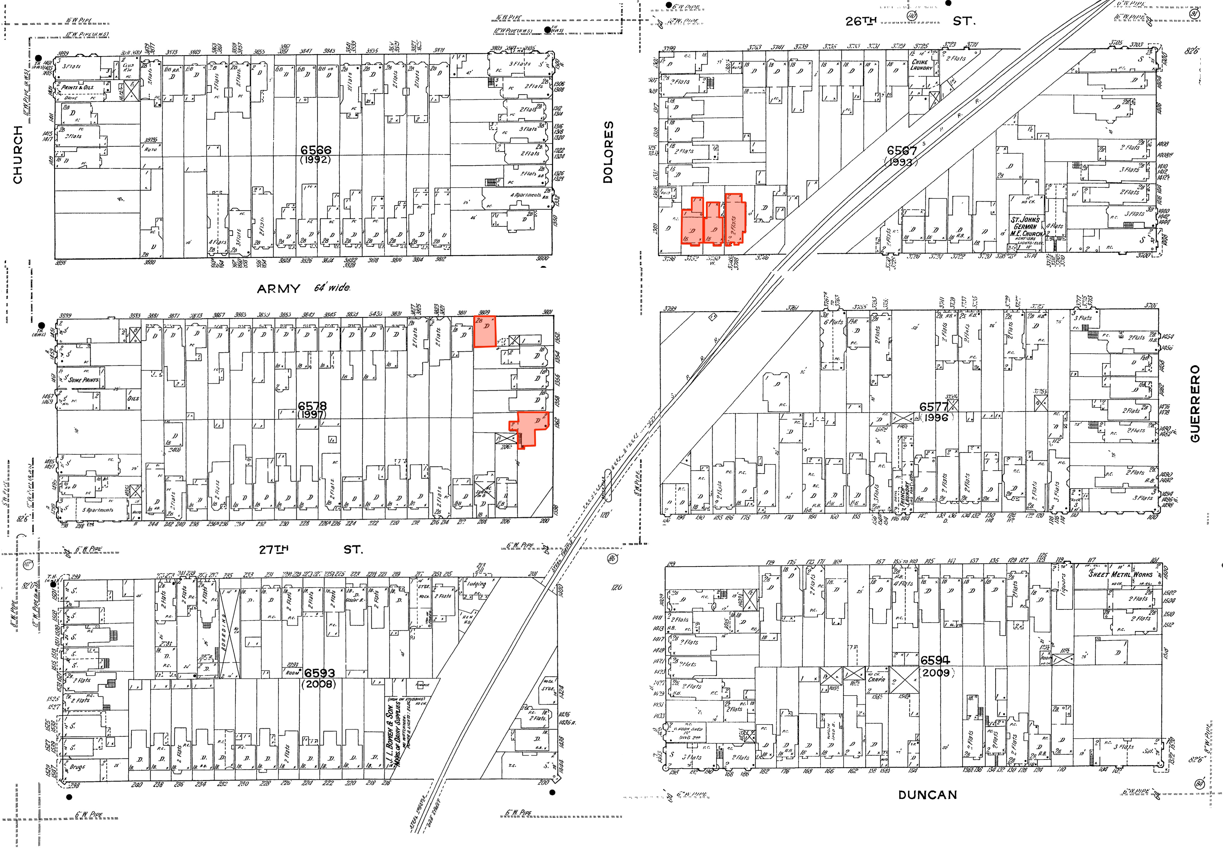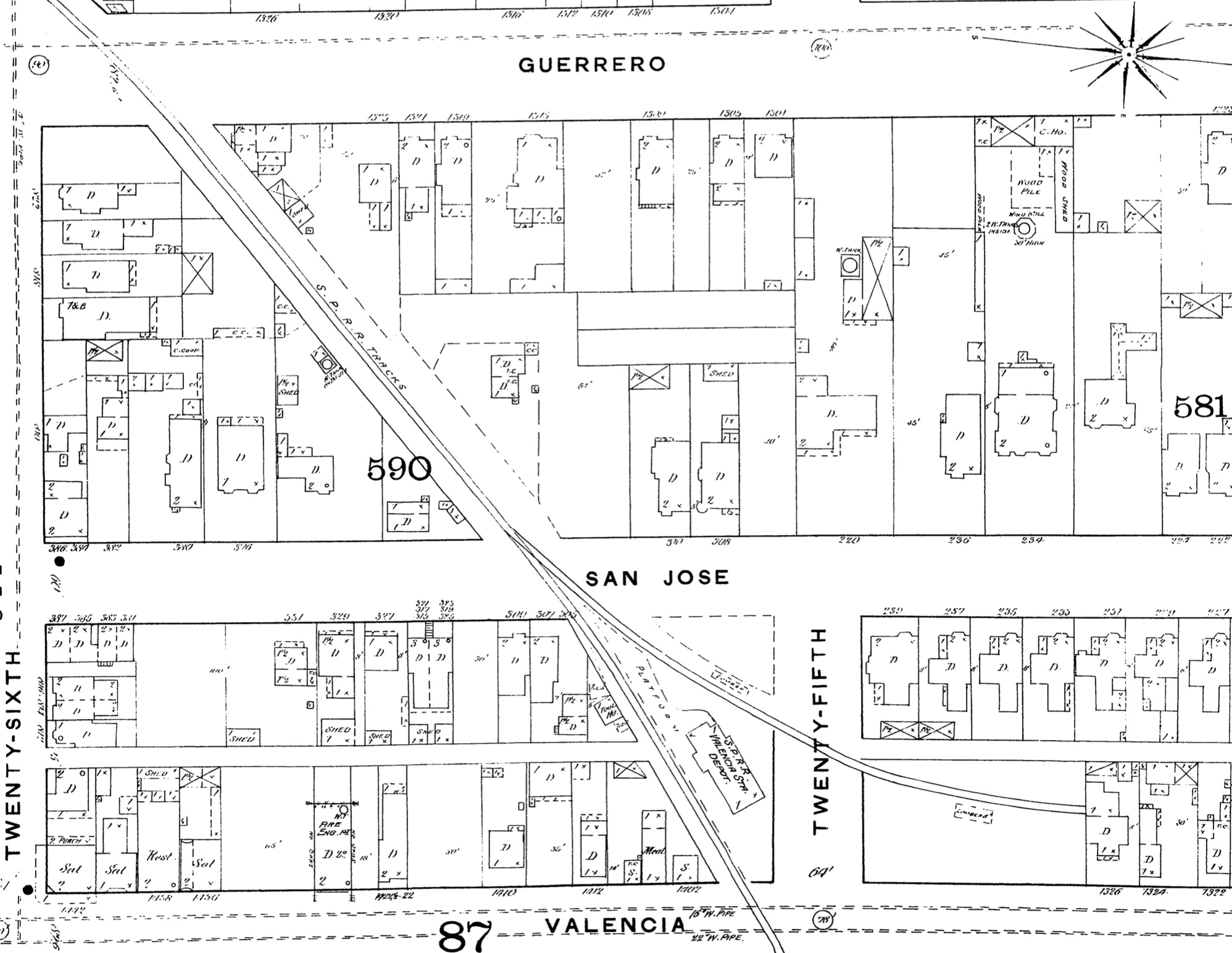 Looking at old timetables from the late 19th and early 20th century, it was possible to get from the train station at Valencia and 25th to Palo Alto in less time that it takes today on Caltrain and BART. Here’s the station from the 1889 Sanborn map (San Francisco 1886-1893 vol.+3, 1889, Sheet 88_a):