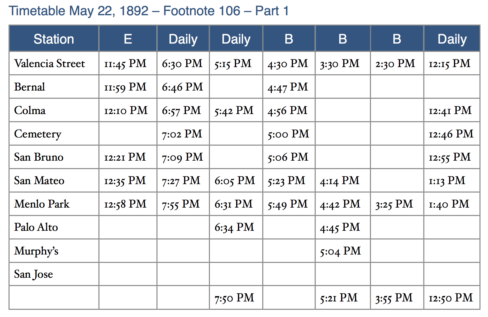 This rather incredible report on the history of the SF to SJ line written in the 1940s has 1892 schedule and fare information. 55 minutes to Menlo Park. 1:11 to Palo Alto.
