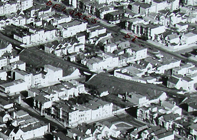 I hadn’t realized that the all-knowing FoundSF had written a piece on the Dolores Street Trestle (hey, great band name) until after I started this post. They found this rather amazing photo taken around 1940, just a few years before the funeral train service was stopped and service on the line completely shut down.