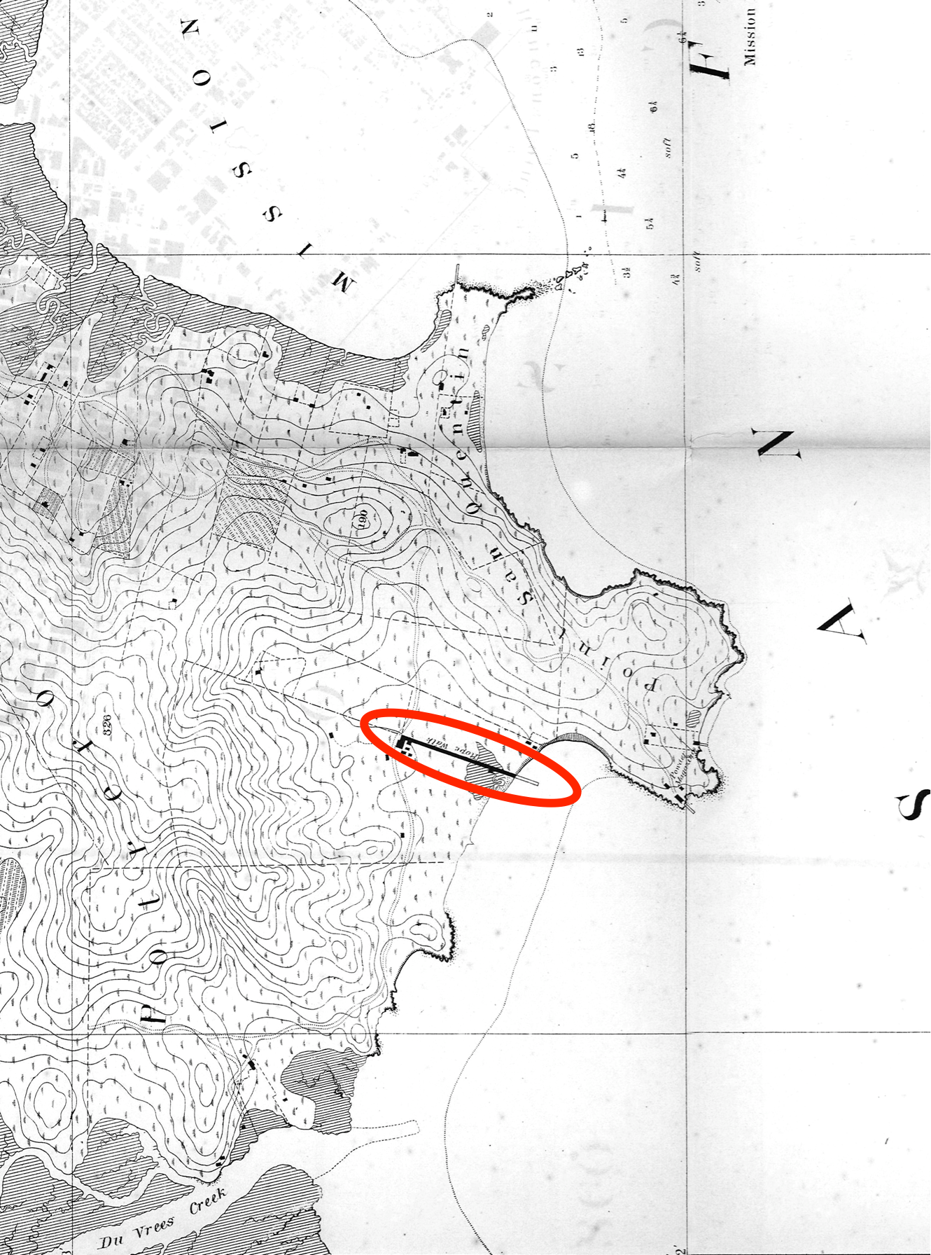 And just to give you an idea of how utterly isolated the area was while downtown SF boomed, here’s the rope walk sometime after 1857 (looking north, with the Bay on the right).