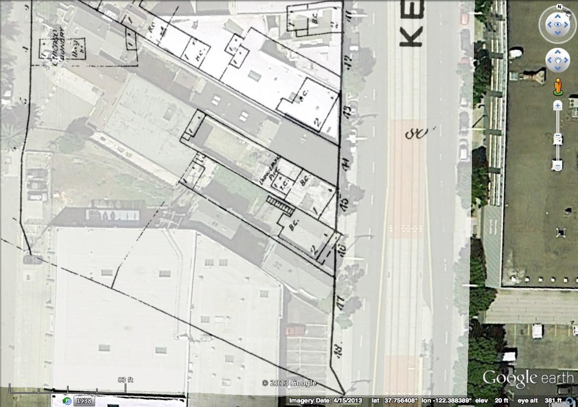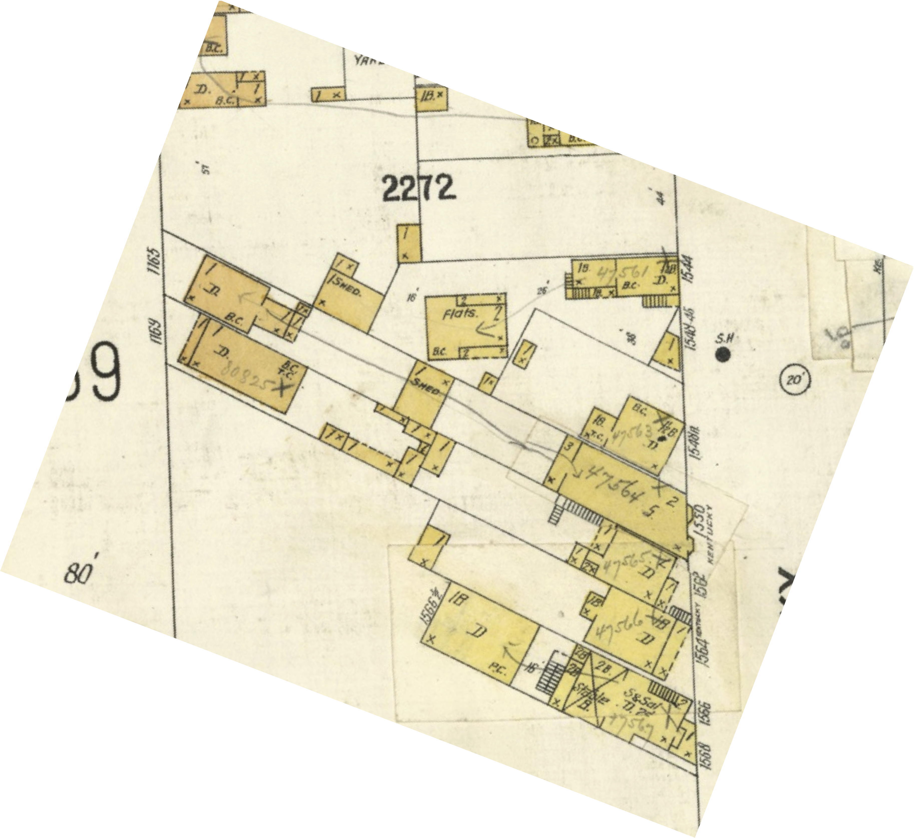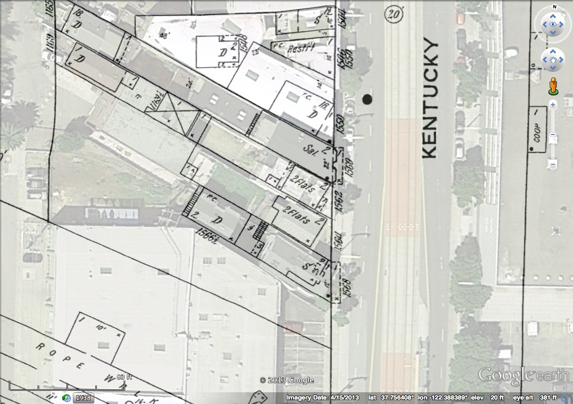 Overlaying the 1886 maps, the lots look the same, but the buildings, 46 aka 1564 and 45 aka 1562 Kentucky look different, and that saloon (which I can’t yet track down) isn’t there: