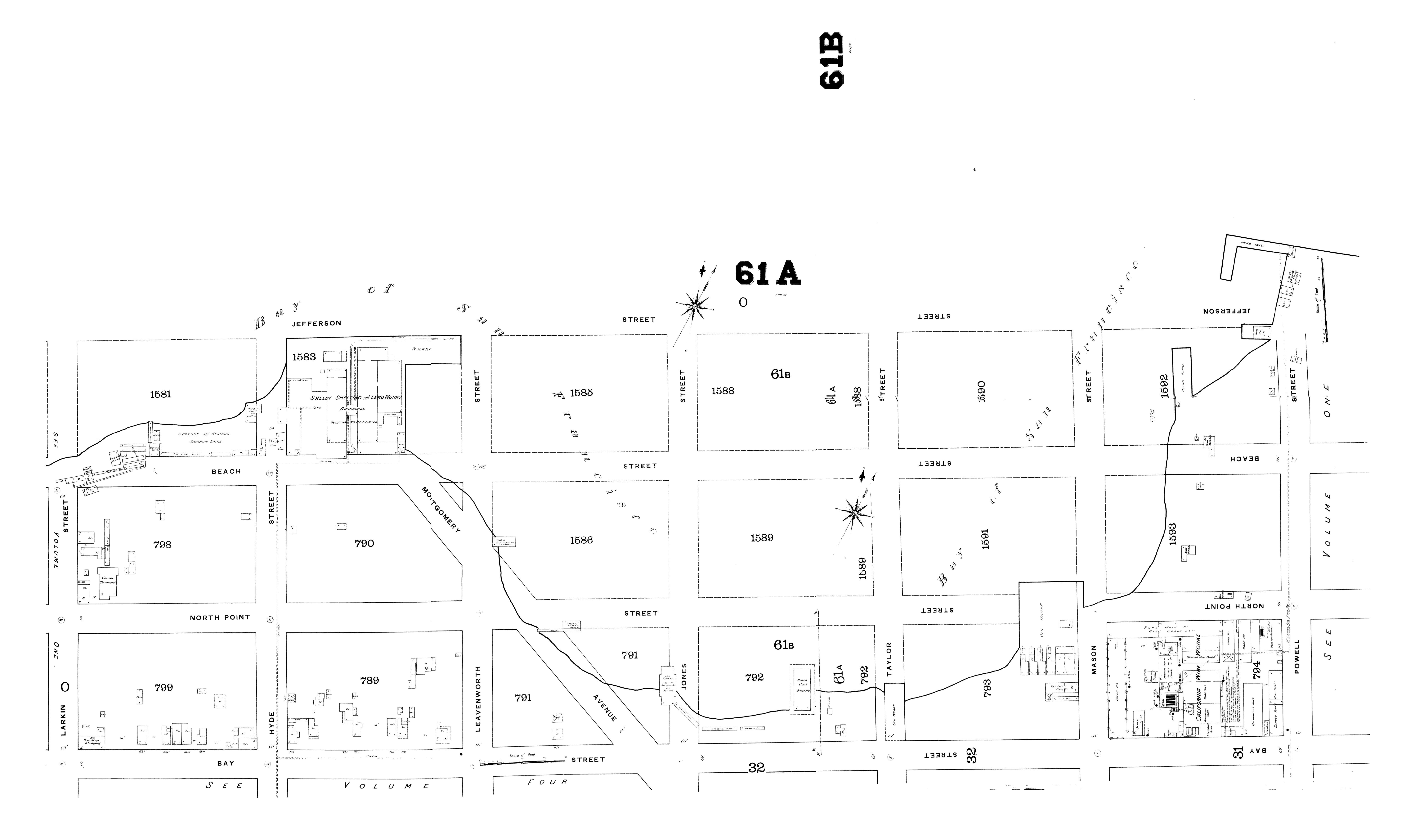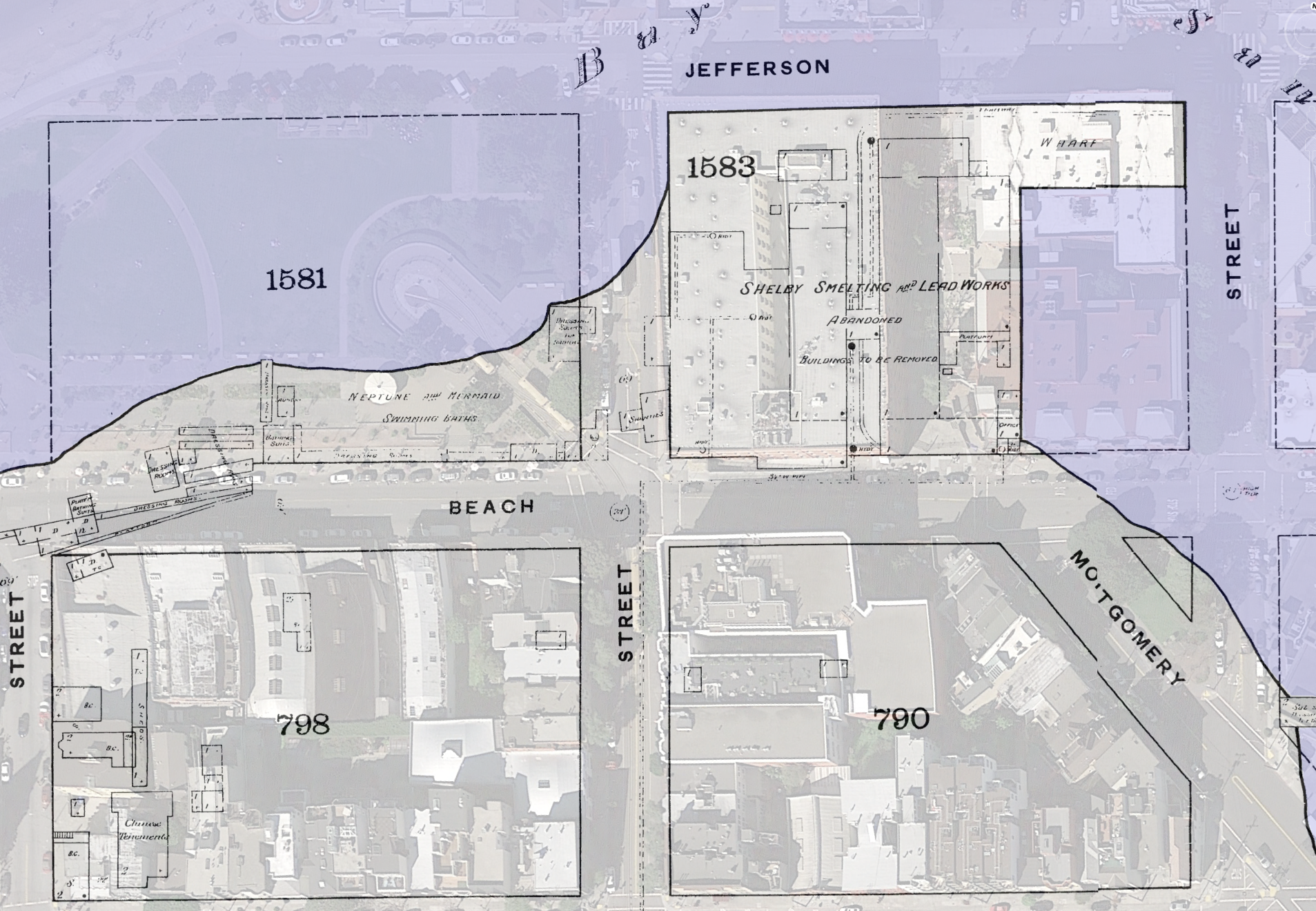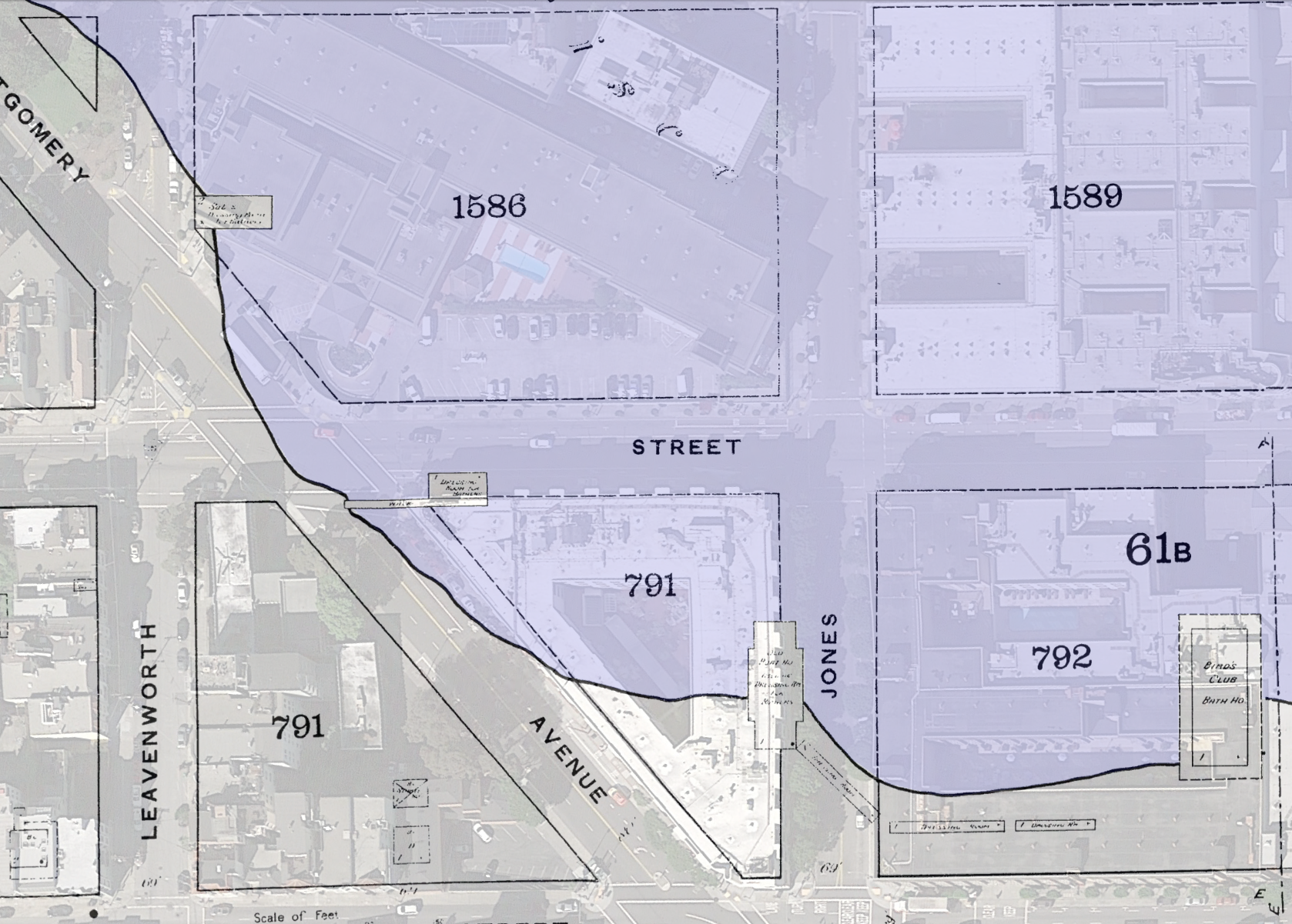 Just one of those maps that makes your brain hurt. The (near) original San Francisco coast via the 1886 Sanborn Maps, when Bay St ran next to San Francisco Bay, and Beach St was water lots. Montgomery is today’s Columbus. (Click to zoom).