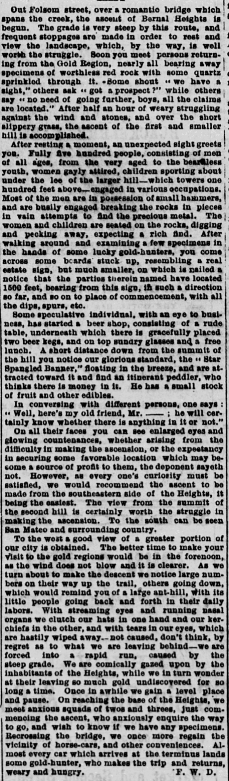 After playing in Precita Place, perhaps his sister Eliza preambulated Jack over to Graham’s Groceries on Alabama and “27th St”! And perhaps they were able to “comically gaze upon” the throngs of San Franciscans crossing Precita Creek over “the romantic Folsom St bridge” the Great Bernal Gold Rush of May 1876.